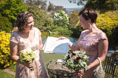 'We marvelled at your ability to convert our words and ideas into a script that was poetic, entertaining, heartfelt and true to our intentions. We always felt that you were available if we had queries and you responded promptly and thoughtfully. We were amazed at the work you put in and at your great suggestions. Throughout the whole process you were clear, professional, warm and sensitive to our wishes. When it came to the BIG DAY we knew we could rely on you to be organised and prepared – and you were. Guests later commented that they thought you were a wonderful celebrant – that you allowed us to shine. With your help we created a ceremony that perfectly reflected us and our relationship and our thoughts on marriage. Thank You! P.S. We wracked our brains, but couldn't think of any areas for improvement.'